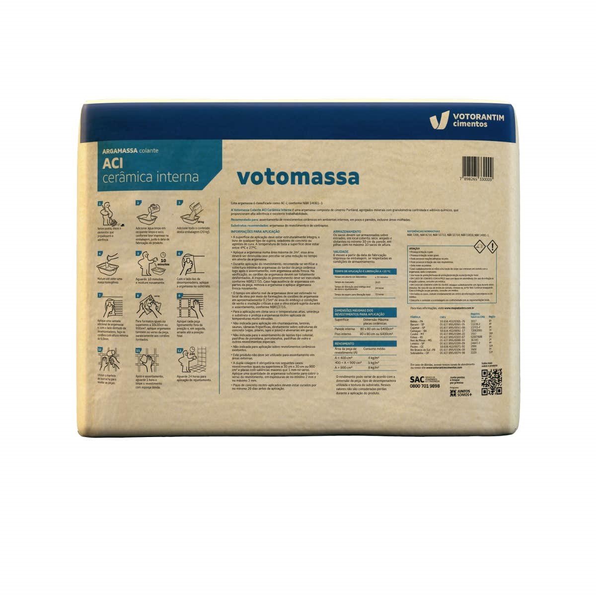 Essa argamassa colante, de qualidade 100% Votorantim, é preparada com cimento Portland, agregados minerais e aditivos químicos de qualidade, garantindo eficiência para revestimentos de até 80 x 80 cm.