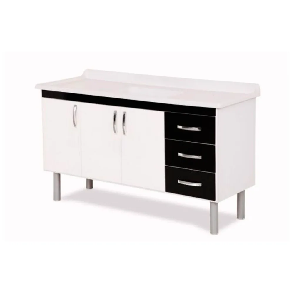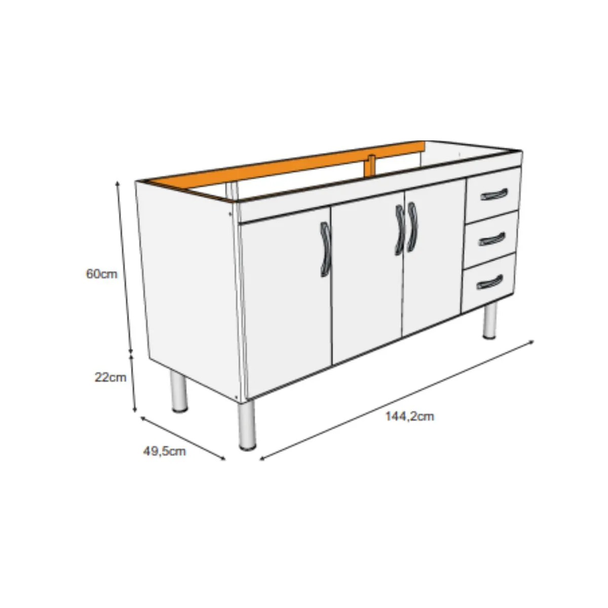 | Estrutura reforçada com madeira de reflorestamento próprio; Frente de portas e gavetas em MDP; Maior espaço interno; Corrediças Metálicas; Puxadores Alça; Calço e dobradiça de metal; Pré-montado.Pés 22cm NÃO ACOMPANHA PIA |